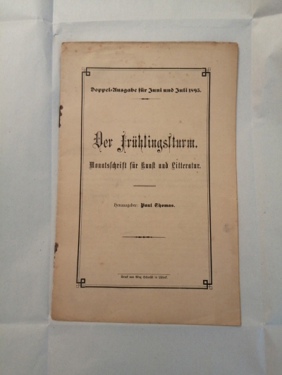 Am vergangenen Mittwoch, 22. Juni, kam ein kleiner Schatz im Buddenbrookhaus an: Ab sofort zählt die Sommerausgabe von Juni / Juli 1893 der Schülerzeitung des Lübecker Katharineums mit dem programmatischen Titel „Der Frühlingssturm“ zum Besitz des Literaturmuseums. Herausgeber und Chefredakteur der Zeitung war kein geringerer als der damals 18-jährige Thomas Mann, der unter dem Pseudonym „Paul Thomas“ für das Blatt verantwortlich zeichnete und einen Großteil der darin enthaltenen Texte verfasste.