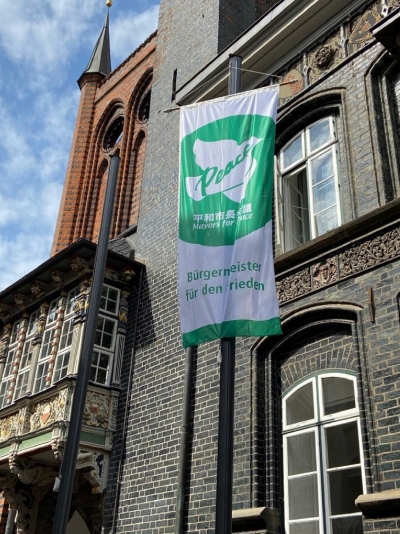 Heute, 8. Juli 2022, weht vor dem Lübecker Rathaus wieder die Flagge des weltweiten Bündnisses der Mayors for Peace. Mehr als 500 Städte in Deutschland zeigen mit der Aktion in diesem Jahr ihre Solidarität mit der Ukraine und setzen sich für eine friedliche Welt ohne Atomwaffen ein.
