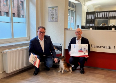 Bürgermeister Jan Lindenau und Manfred Uhlig, Bereichsleiter Haushalt und Steuerung, stellen gemeinsam mit Hund Barni die neue Hundebroschüre der Hansestadt Lübeck vor.