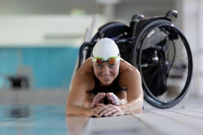 Mehrfache Paralympics-Siegerin Kirsten Bruhn ist am 4. Februar 2023 zu Gats beim inklusiven Aktionstag „Schwimmen für alle“ im Schwimmbad Kücknitz.