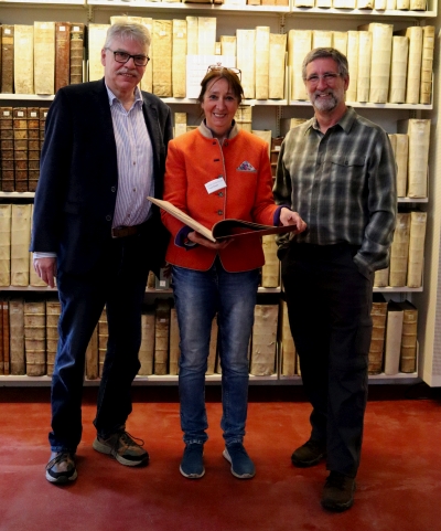 Von links nach rechts zu sehen: Dr. Hans Jacobs, Angela Buske (stellvertretende Bibliotheksleitung), Breck Bartholomew mit dem verschollenen Bibliotheksband.