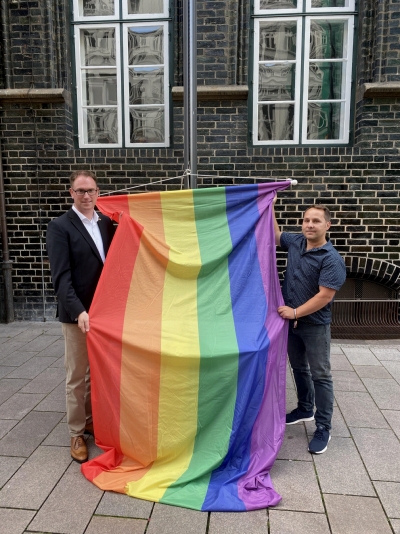 Bürgermeister und CSD-Schirmherr Jan Lindenau, hisst gemeinsam mit Christian Till, dem ersten Vorsitzenden des Vorstands des Lübecker CSD e.V., die Regenbogenfahnen vor dem Lübecker Rathaus.