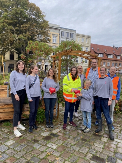 Ernte sei Dank! Viele Lübecker:innen und Gäste warteten am Sonntag, 1. Oktober 2023, gespannt auf dem Koberg, um auf Einladung der Lübeck und Travemünde Marketing GmbH (LTM) pünktlich ab 14 Uhr den ÜBERGANGSGARTEN abzuernten. Zur Auswahl standen Stauden, Blumen, Gräser, Erdbeer- und Gemüsepflanzen und Kräuter aus insgesamt 180 bienenfreundlich bepflanzten Hochbeeten, die seit dem 3. Juli für eine grüne Oase und einen beliebten Treffpunkt in der Innenstadt gesorgt hatten. Rechtzeitiges Erscheinen sicherte die beste Ernte gegen eine Spende für den Herzenswärme-Bus des Vereins Obdachlosenhilfe Lübeck. Insgesamt konnte eine Spendensumme von 1.210,30 Euro eingenommen werden, die Tanja Seifert, Arne Flindt und Hendrik Trapp vom Verein Obdachlosenhilfe Lübeck am Ende des Tages persönlich entgegennahmen. Der KO15 Lebenshof aus Selmsdorf hat die bei der Ernteaktion übriggebliebenen Pflanzen abgeholt und ihnen eine neue Heimat gegeben. Die abgeernteten Hochbeete aus Holz wurden von der LTM eingelagert und werden für künftige Urban Gardening-Aktionen in der Innenstadt wiederverwendet. Übrigens: Auch die ÜBERGANGSWIESE auf dem Schrangen hat sich am ÜBERGANGSWOCHENENDE aus der Innenstadt verabschiedet und wurde bereits abgebaut.