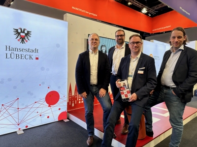Dr. Jens Meier (CEO Stadtwerke Lübeck Gruppe), Dr. Stefan Ivens (Chief Digital Officer Hansestadt Lübeck), Bürgermeister Jan Lindenau und Christoph Schweizer (COO Stadtwerke Lübeck Digital) stellen auf der Smart Country Convention 2023 innovative Projekte der Hansestadt Lübeck vor.