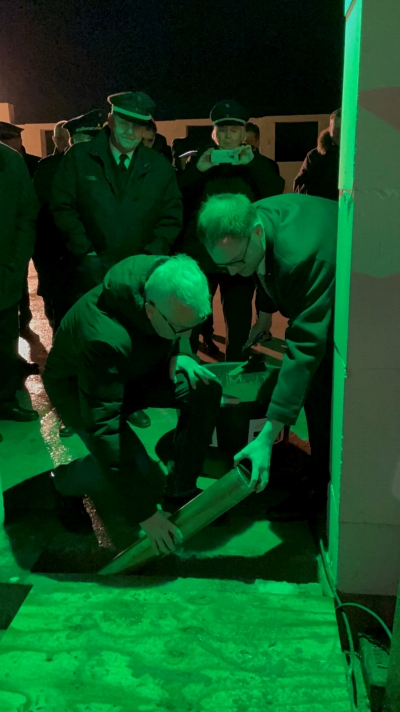 Senator Ludger Hinsen und Bürgermeister Jan Lindenau versenken die Zeitkapsel im Grundstein (21.12.2023)