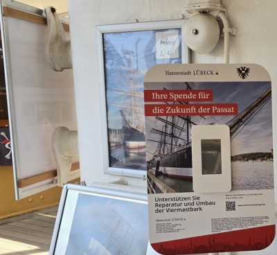 Ab sofort befindet sich im Kassenbereich der Viermastbark Passat eine Spendensäule, die es Besucher:innen ermöglicht, unkompliziert und bequem per Bankkarte für den Erhalt der Passat zu spenden. Der Spendenbetrag kann dabei frei gewählt werden. Für die Zeit nach der Besuchssaison Ende Oktober werden zudem engagierte Kooperationspartner:innen gesucht, die bereit sind, die mobile Spendensäule von November 2025 bis März 2026 jeweils für einen Monat an ihren eigenen Standorten aufzustellen.