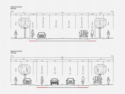 Auf den bisherigen Radwegen wurden sogenannte Sicherheitstrennstreifen markiert, hinter denen die Autos nun parken. Dadurch entsteht ein ausreichender Abstand zwischen Radverkehr und parkenden Fahrzeugen, sodass gefährliche Dooring-Unfälle verhindert werden. Das Parken ist zwischen den Bäumen möglich – von den bisherigen 50 Stellplätzen bleiben 38 erhalten.