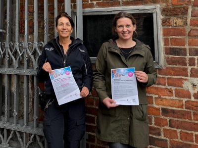 Silke Ziemann (Leiterin der Präventionsstelle der Polizeidirektion Lübeck) und Ann-Kathrin Röttgerding (Geschäftsführerin des Kommunalen Präventionsrats der Hansestadt Lübeck) präsentieren die Plakate zur Veranstaltungsreihe "Wir wollen, dass Sie sicher leben!".