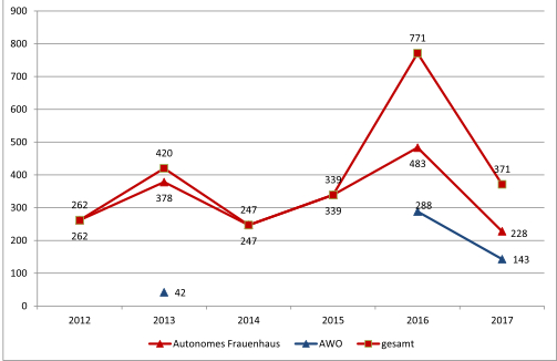 2017 nahmen 621 Personen (von Gewalt betroffene Frauen und Mädchen oder unterstützende Personen) Beratung in Anspruch, dabei ging es bei 315 Personen um häusliche Gewalt, bei 402 um sexualisierte Gewalt und bei 35 um Stalking. Die Zahl der beratenen Personen schwankte zwischen 683 im Jahr 2015 und 621 im Jahr 2017.