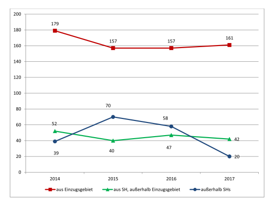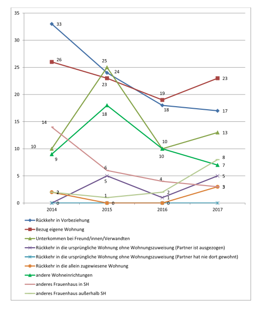 Auch landesweit stieg die Zahl der weiblichen Opfer von 270 im Jahr 2014 auf 486 im Jahr 2017 (+80%). 129 der weiblichen Opfer (26%) lebten in einer Ehe/Partnerschaft mit dem Täter, 222 hatten „informelle soziale Beziehungen“(46%), 21 „formelle“ (4%) und 95 keine Beziehungen (19%) zum Täter (LKA, PKS SH 2017: 45).