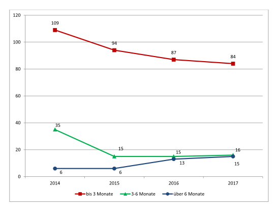 Die Zahl der anhängigen Verfahren „Gewalt in der Familie“ bei der Staatsanwaltschaft im Landgerichtsbezirk Lübeck stieg in den vergangenen Jahren stark an. 2013 wurden weit mehr als doppelt so viele Verfahren gezählt als 2003 (2003: 875 Verfahren, 2013: 1963). Im Berichtszeitraum, also zwischen 2014 und 2017, blieb die Zahl der Verfahren allerdings relativ konstant. 2014 gab es 1834 Verfahren, 2017 waren es 1819.