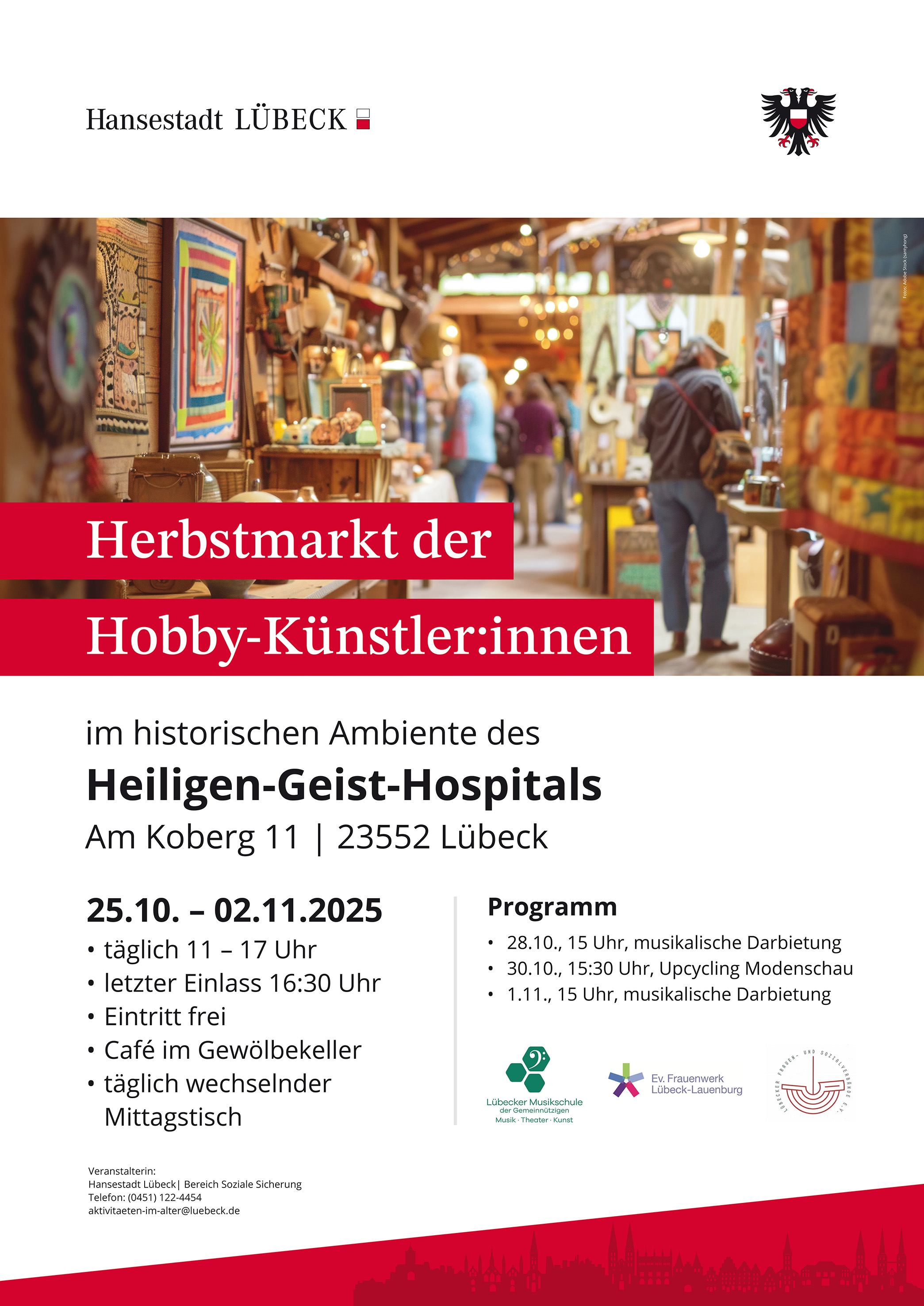 Der Herbstmarkt der Hobbykünstler:innen im historischen Ambiente des Heiligen-Geist-Hospitals Lübeck öffnet vom 25. Oktober bis zum 2. November 2025 seine Türen. Senior:innen, Menschen mit Behinderungen sowie soziale Organisationen präsentieren hier ihre vielfältigen Werke. Veranstaltet wird der Markt vom Bereich Soziale Sicherung der Hansestadt Lübeck. Die feierliche Eröffnung übernimmt die Senatorin für Wirtschaft und Soziales, Pia Steinrücke, am Samstag, den 25. Oktober. Im Anschluss daran ist die Ausstellung ab 11 Uhr für Besucher:innen geöffnet.