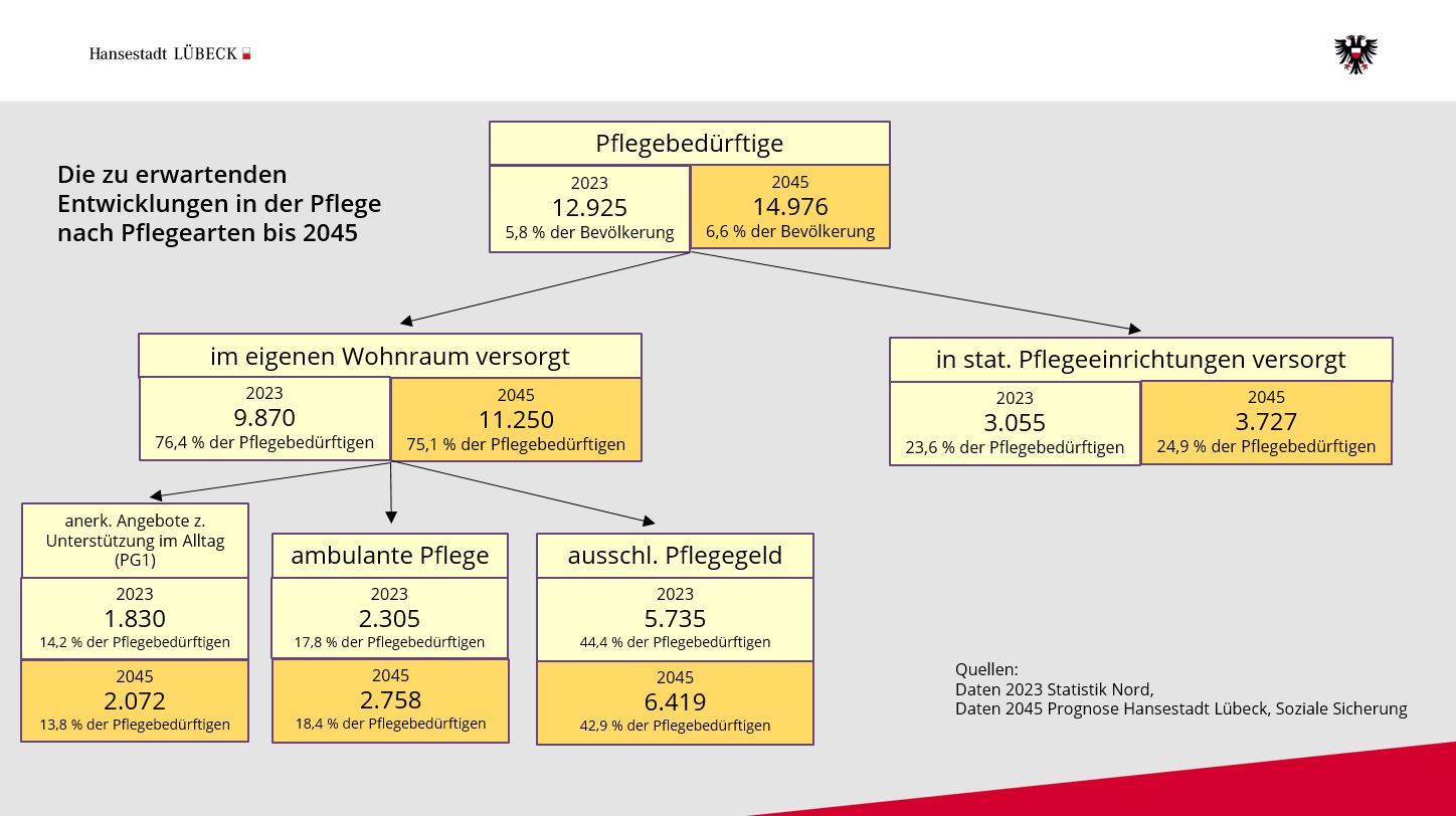 Die neue Bevölkerungs- und Haushaltsprognose der kommunalen Statistikstelle für die Jahre 2025 bis 2045 zeigt, dass die Bevölkerung einerseits weiterwächst, andererseits jedoch zunehmend altert. Dies wird Auswirkungen auf den zukünftigen Pflegebedarf in der Hansestadt Lübeck haben. Insgesamt ist bis 2045 mit rd. 15.000 Pflegebedürftigen zu rechnen.