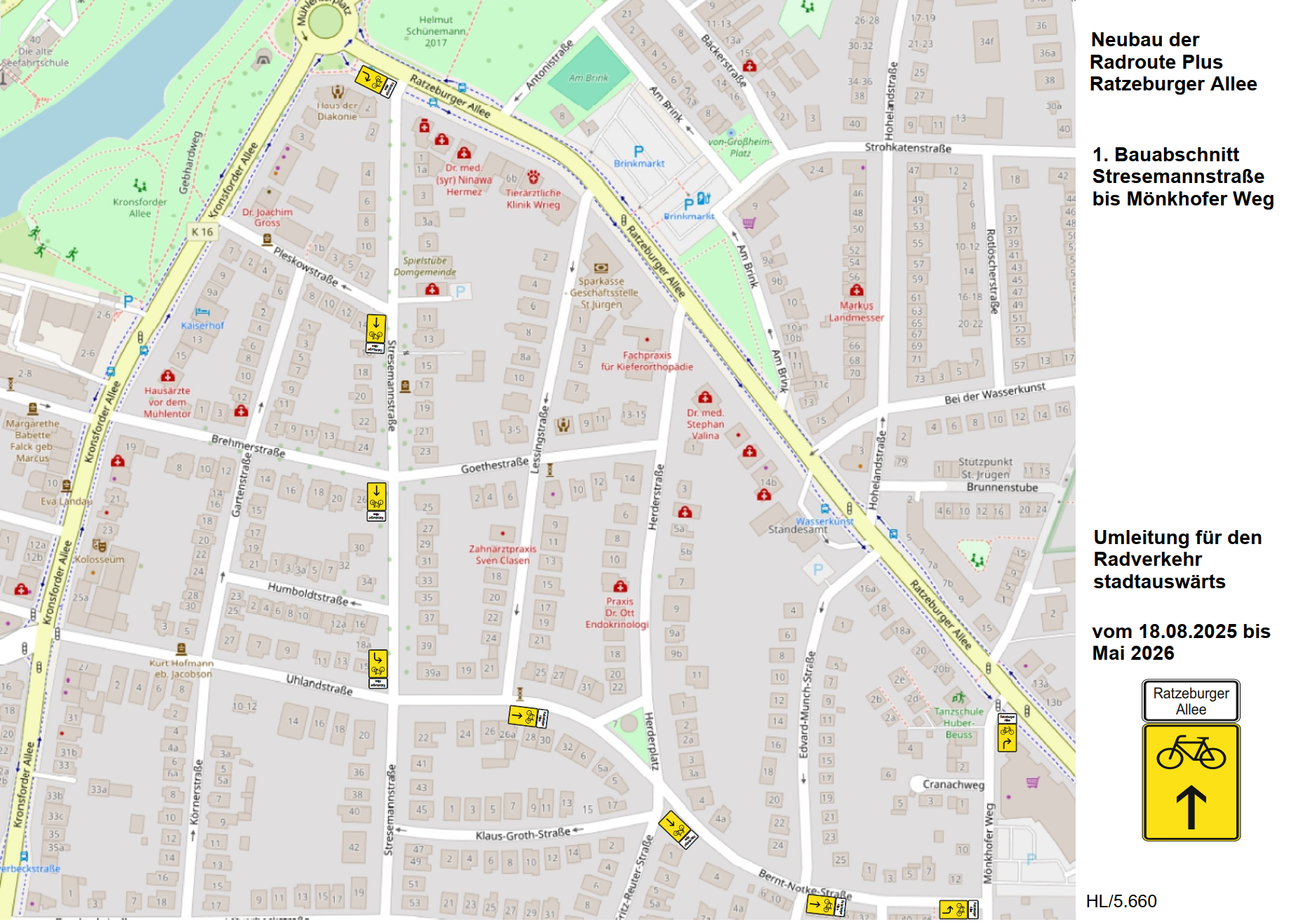 Die gelben Markierungen zeigen Radverkehrsmassnahmen an. Die blauen Kreise weisen auf Fahrrad-Reparaturstationen in der Hansestadt Lübeck hin. Detaillierte Informationen erhalten Sie nach einem Klick auf die Kreise. Die Karte wird fortlaufend ausgebaut und somit noch mehr fahrradspezifische Informationen angezeigt.