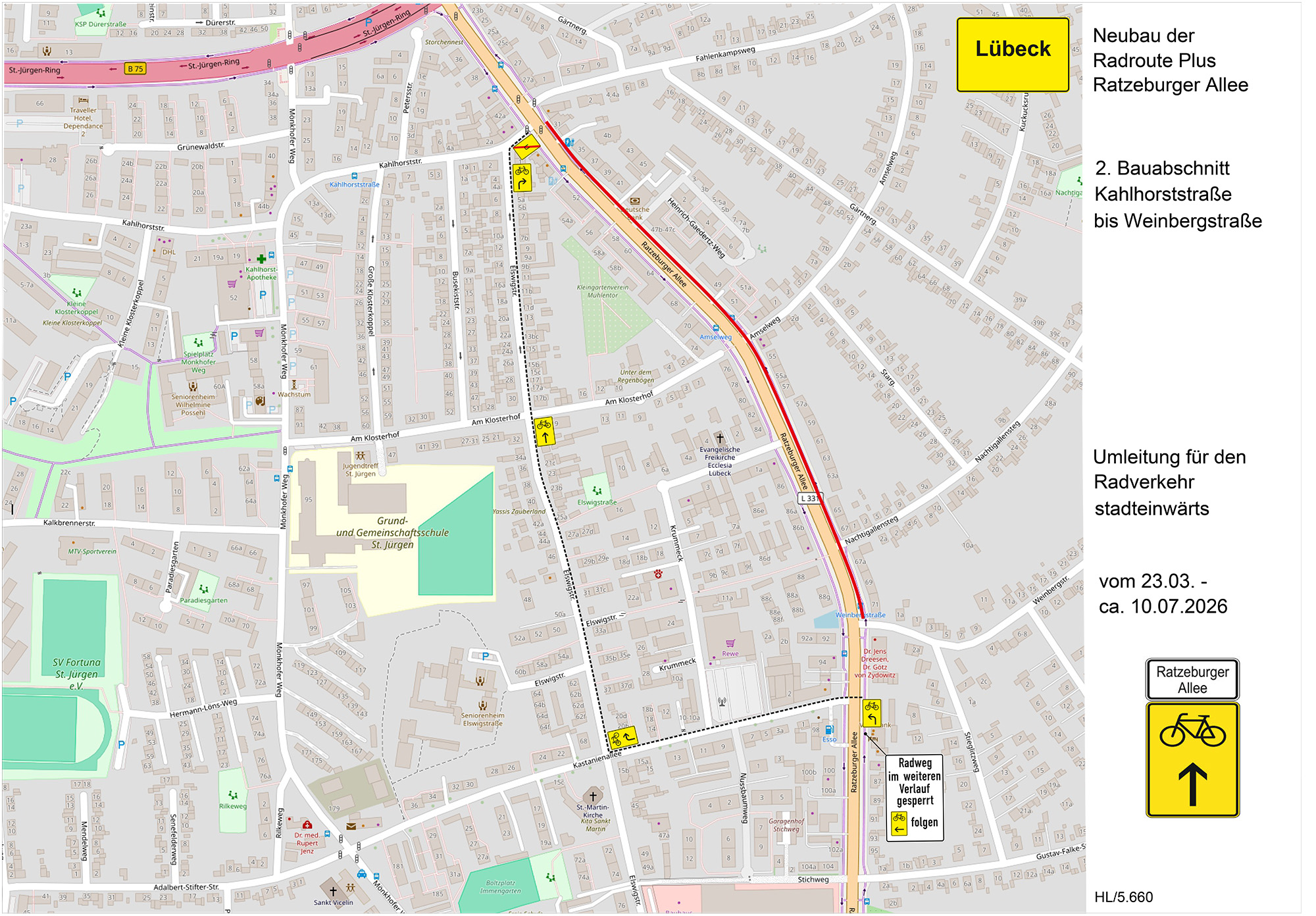 Die Fahrbahndecke ist zwischen Walderseestraße und Hövelnstraße auf einer Länge von ca. 340 m frisch saniert. Auf den ehemaligen Radwegen sind sogenannte Sicherheitstrennstreifen markiert worden, hinter denen die Kfz parken. Damit wird ausreichend Abstand zu den Radfahrenden beim Türöffnen eingehalten. Dooring-Unfälle durch das Türöffnen werden so vermieden. Geparkt werden dürfen Kfz zwischen den Bäumen. 38 Parkplätze der ehemals 50 Parkplätze bleiben erhalten. Zum Schutz der Bäume sind zusätzlich Poller eingebaut worden. Außerdem wurde der Asphalt an den Bäumen ausgebaut, um durch diese Entsiegelung den Lebensraum der Bäume und die Aufnahme des Regenwassers zu verbessern. Durch den Wegfall von zwei Fahrspuren kann nicht nur der Radverkehr sicherer geführt werden, damit ist außerdem eine Lärmminderung für die Anwohner:innen verbunden.