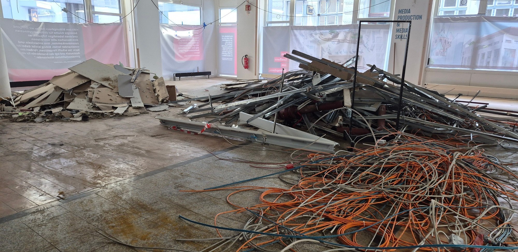 Die Abbrucharbeiten der Deckenkonstruktion samt der verbauten Technik sorgen für große Massen an unterschiedlichen Wertstoffen und Materialien, die selbstverständlich vorher sortiert werden, um dann fachgerecht entsorgt bzw. recycelt zu werden.