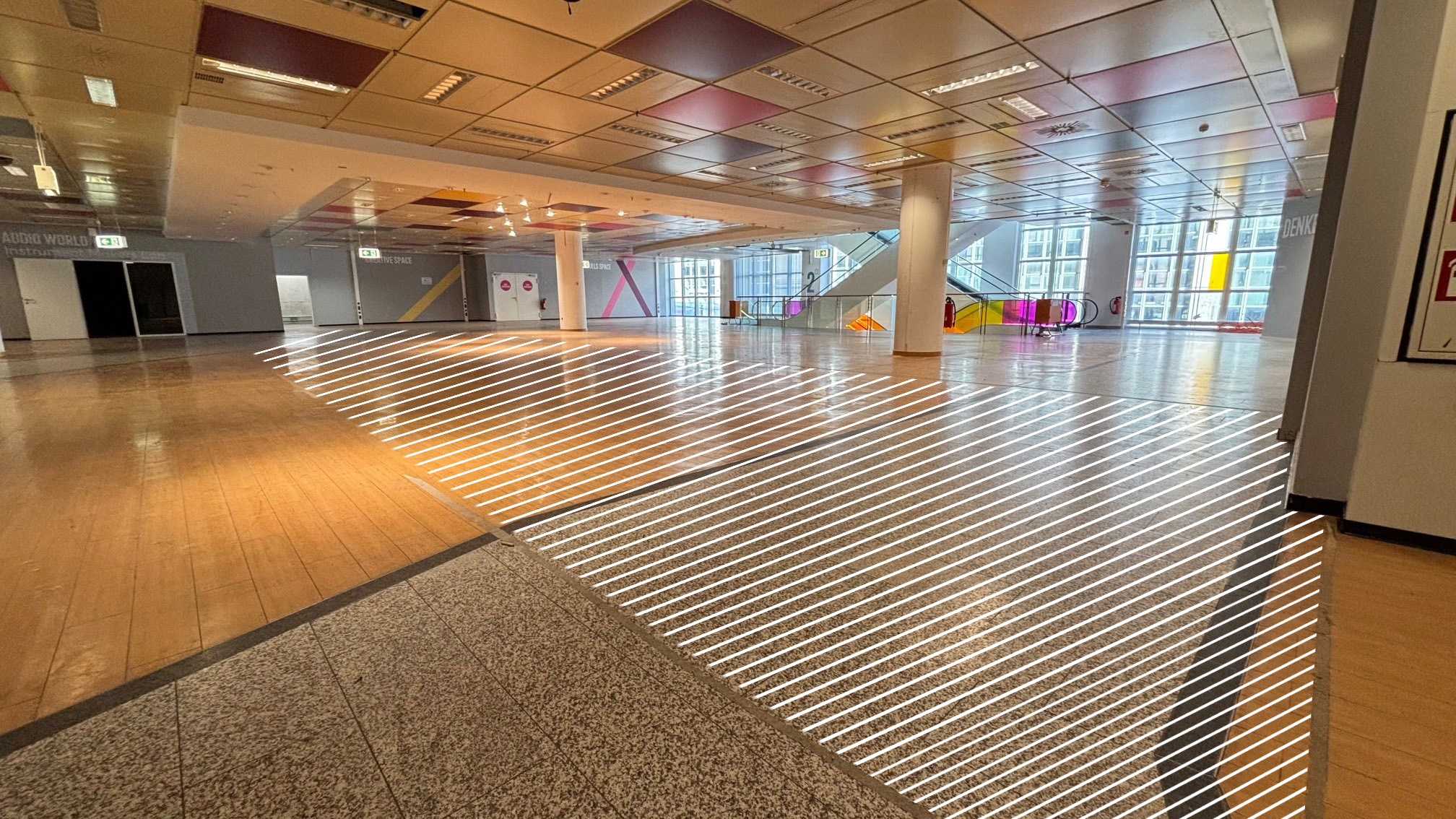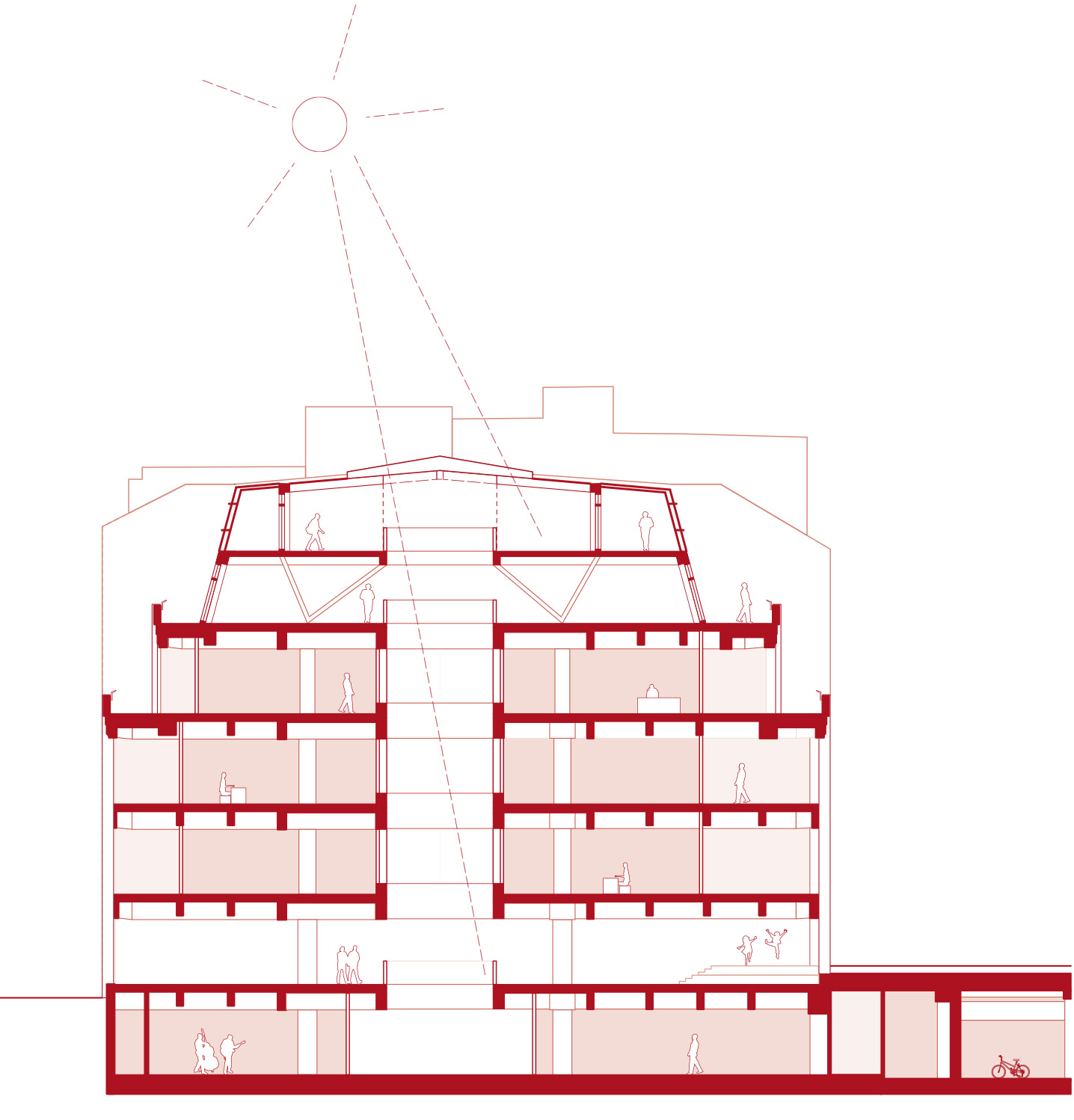 Ein zentrales Atrium sorgt im Bildungshaus für eine offene und lichtdurchflutete Atmosphäre sowie eine natürliche Belüftung. Das geplante Atrium hat eine Größe von 21 x 4 m (schraffierte Fläche) und reicht vom Untergeschoss bis zum Dachgeschoss, d.h. es entsteht eine Gesamthöhe vom Untergeschoss bis zum Glasdach von ca. 30 m (siehe rechte Visualisierung).