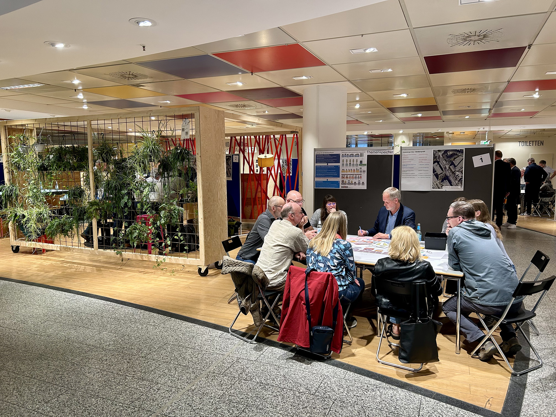 Mitarbeitende der Verwaltung haben eine offene Sprechstunde für Bürger:innen – jeden Mittwoch und Donnerstag im April 2025 – in Ergänzung zu den Veranstaltungen angeboten, um in Erfahrung zu bringen, was die Bürger:innen bewegt. Außerdem wurde eine Ausstellung mit Informationstafeln über die Neuaufstellung des VEP gezeigt, die die wichtigsten Inhalte übersichtlich darstellen und allen Besucher:innen des Übergangshauses frei zugänglich waren.