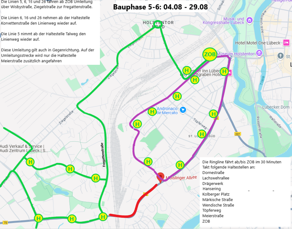 Während der Bauarbeiten im vierten Bauabschnitt (28. Juli bis 2. August) fährt die Ringlinie über Hansering und Stettiner Straße. Hierfür wird eine Ersatzhaltestelle Hansering im Hansering eingerichtet.