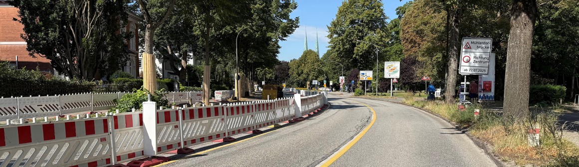 Aufgrund der halbseitigen Sperrung der Straße Ratzeburger Allee im Zuge der Baumaßnahme zum Radschnellweg ist aktuell eine direkte Zufahrt zum Standesamt mit dem Auto oder dem Fahrrad bis voraussichtlich zum Ende des Jahres nicht möglich. Besucher:innen des Standesamtes sowie Hochzeitsgesellschaften sollten daher für Ihre Anfahrt entsprechend mehr Zeit einplanen.