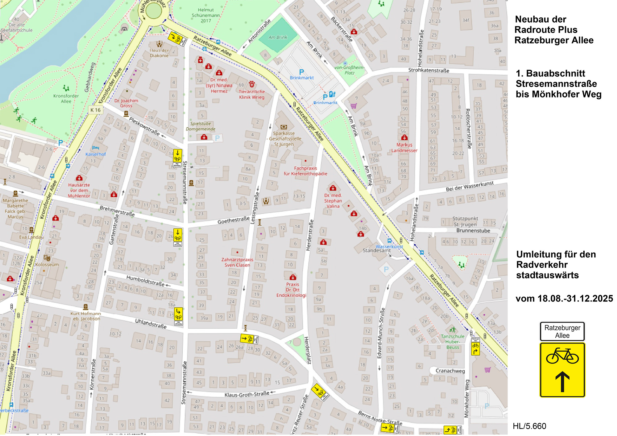 Die Ratzeburger Allee wird zum ersten Radschnellweg Schleswig-Holsteins: Auf rund 2,4 Kilometern vom Norden ab der Einmündung Stresemannstraße bis zur Stadtweide wird zukünftig eine Radverkehrsinfrastruktur nach höchsten Qualitätsstandards entstehen. Die Arbeiten zum Ausbau des Radwegs und die Straßensanierung starten am 4. August 2025 mit dem ersten Bauabschnitt, der bis 23. Juni 2026 andauert.