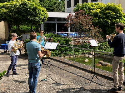 Auf eigene Initiative der Horngruppe des Symphonischen Orchesters der Hansestadt Lübeck erfreuten vier Hornbläser:innen die Bewohner:innen der SeniorInnenEinrichtung Elswigstraße in dieser Woche mit einem Konzert. An den Fenstern konnten diese der Musik lauschen und waren begeistert von der willkommenen Abwechslung. Spätestens beim „Ännchen von Tharau“ sangen viele Bewohner:innen lautstark mit.