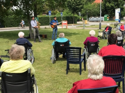 Stefan Kuchel und Patrick Farrant, beides Dozenten der Musikhochschule Lübeck, erfreuten die Bewohner:innen der SeniorInnenEinrichtung Dornbreite heute mit einem Freiluftkonzert. Mit Saxophon und Gitarre präsentierten sie eine Bandbreite an brasilianischen Rhythmen bis hin zum Bossa Nova. Alle Lieder, von „Mecki Messer“ bis „Hello Dolly“, waren den Anwesenden bestens bekannt. Es wurde gesummt und geschunkelt – eine insgesamt willkommene Abwechslung im Alltag.