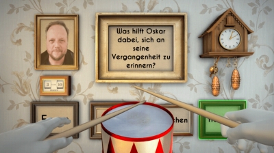 Brausepulver mischen, Glas zersingen, Oskars Geburtstagstorte auspusten oder Trommelstöcke schwingen – all das ist nun mit Hilfe eines kontaktlosen, gestenbasierten Sensors möglich. Moderator ist Deutschrapper Smudo von den Fantastischen Vier, der die Fragen nicht nur stellt, sondern im Anschluss auch die richtige Antwort mit einem Kommentar oder einer Textpassage aus der Blechtrommel ergänzt. Die Fragen thematisieren die Handlung rund um Oskar Matzerath, die berühmte Verfilmung Volker Schlöndorffs sowie die internationale Rezeptionsgeschichte des Debütromans von Günter Grass. Am Ende werden die Teilnehmer:innen anhand ihrer Antworten mit einem klassischen Highscore in drei Kategorien eingeteilt. Doch egal ob Blechtrommel-Expert:in, BlechtrommelKenner:in oder Blechtrommel-Anfänger:in, der Spaß und die spielerische Wissensvermittlung stehen im Vordergrund.