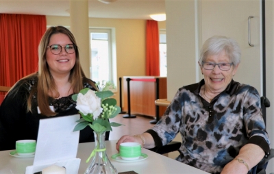 Gemeinsam am Kaffeetisch ohne Mundschutz und übergroßen Abstand: Erna Fischer (85) mit Lenya Meier (25), Mitarbeiterin im Lotti-Tonello-Haus