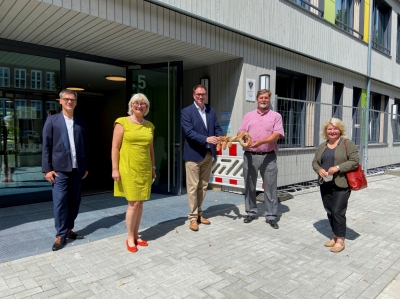 Schlüsselübergabe an die Kalandschule v. li. n. re.: Steffen Soltau, sso architekten bda, Monika Schröder, Betreuungsband Kaland-Schule gGmbH, Ulf- Michael Cosmus, Schulleiter Kalandschule, Jan Lindenau, Bürgermeister Hansestadt Lübeck, Joanna Hagen, Bausenatorin Hansestadt LÜbeck (27. Juli 2021)