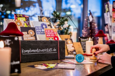 Ganz neu in der Komplimentefamilie ist das kleine Komplimentegässchen in der Fußgängerzone in der unteren Breite Straße, das zum ‚kleinsten Schaufensterbummel der Welt‘ einlädt. In den 24 Schaukästen der neuen Weihnachtsmarkthütten sorgen weihnachtliche Komplimente für einen besinnlichen Zwischenstopp in der Fußgängerzone beim Bummel durch die Weihnachtsstadt.