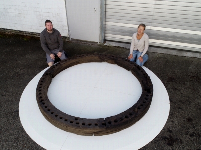 Restauratorin Sylvia Morgenstern und Grabungsfacharbeiter Dennis Adam zeigen das fertig restaurierte mittelalterliche Kammrad. (30. November 2021)