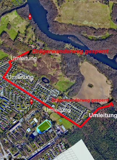 Durch den Sturm der vergangenen Tage wurden einige Bäume entlang der Wakenitz auf Teile des Drägerweges geworfen. Eine sehr mächtige Pappel, die nur über die Wakenitz abtransportiert werden kann, hat dabei den Weg so stark beschädigt, dass er gesperrt werden musste. Eine Umleitung wurde eingerichtet.