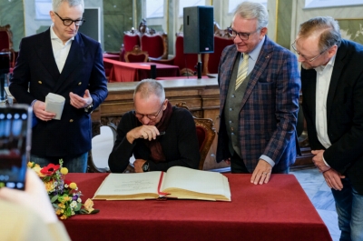 Senator Ludger Hinsen, Sänger Sting, Stadtpräsident Klaus Puschaddel und Peter Petereit, Aufsichtsratsvorsitzender des Theaters Lübeck, bei der Eintragung ins Goldene Buch der Stadt. (v.l.n.r.) (28. März 2022)