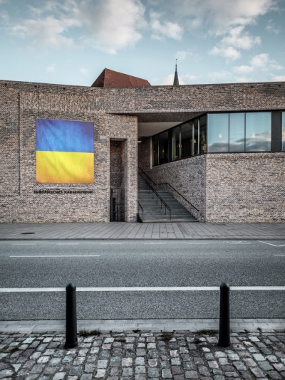 Die Fassade des Europäischen Hansemuseums mit der Ukraine Flagge. (25. Mai 2022)