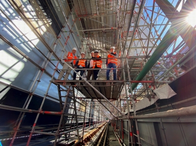 Sönke Kreft, DB Netz AG, Leiter Betrieb, Christine Woldt, Abteilungsleiterin Hafenbahn LPA, Michael Stödter, Verkehrsbeauftragter der Hansestadt Lübeck, Joanna Hagen, Senatorin für Planen und Bauen und Torsten Weppler, Nah.SH, erläutern die Sanierung der Eisenbahnbrücke über die B 75 Lübeck-Travemünde