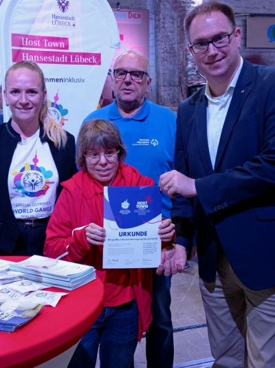 Auf der vergangenen EhrenamtMesse am Sonntag wurde die Hansestadt Lübeck für ihr Engagement im Rahmen des Host Town Programm der Special Olympics World Games Berlin 2023 ausgezeichnet. Dieter Lutz, Vizepräsident der Special Olympics Schleswig-Holstein, und Lorna-Noreen Baars vom Organisationskomitee der Weltspiele aus Berlin überreichten Bürgermeister Jan Lindenau dazu eine Urkunde.