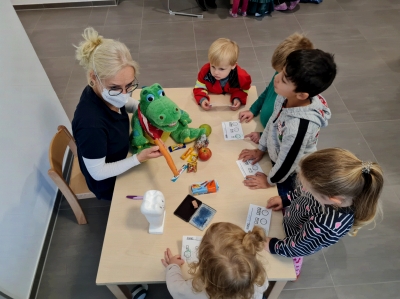 Nach dem Frühstück ging es zurück in die Kita-Gruppen. Dort wartete schon das Zahnputz-Krokodil Willi! Gemeinsam mit ihm wurde das Zähneputzen zuerst in der Theorie geübt, dann wurden die eigenen Zähne in den Waschräumen der sechsgruppigen Einrichtung gepflegt. „Hin und her, hin und her, Zähne putzen ist nicht schwer…“, wiederholten Max und Can, beide 5 Jahre alt, sowie alle anderen Kinder die Ansage der Prophylaxekraft Sabine Strelow. Außerdem gab es weitere Tipps zur Zahnhygiene.