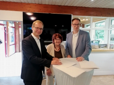 Übergabe und Vertragsunterzeichnung, v.l.n.r. Guido Wendt, Staatssekretär im Ministerium für Allgemeine und Berufliche Bildung, Wissenschaft, Forschung und Kultur, Ingrid Schatz, Vereinsvorsitzende Grenzdokumentationsstätte Lübeck-Schlutup e.V. und Jan Lindenau, Bürgermeister Hansestadt Lübeck