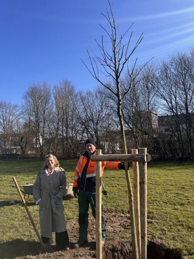 Baumpflanzung Orkneypark; v.l.n.r. Katrin Petelkau von der Volksbank und Christoph Dehn, Vorarbeiter der Hansestadt Lübeck