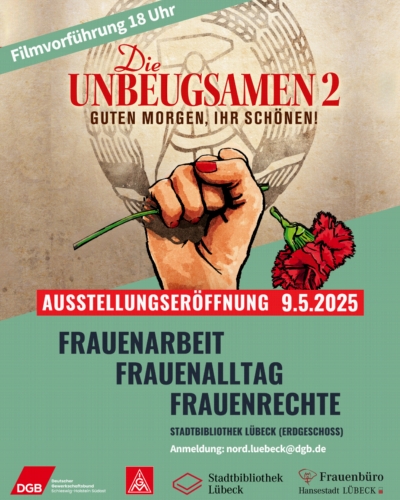 Offiziell eröffnet wird die Ausstellung am Freitag, 9. Mai, 17 Uhr von Petra Kallies, Pröpstin des Kirchenkreises Lübeck-Lauenburg, und Silke Meyer, Leiterin des evangelischen Frauenwerkes Lübeck. Um 18 Uhr wird der Film „Die Unbeugsamen 2 – Guten Morgen, Ihr Schönen“ gezeigt. Zur Eröffnungsveranstaltung ist eine Anmeldung nötig bis zum 2. Mai 2025 unter nord.luebeck@dgb.de.