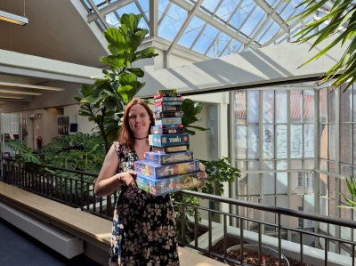 Anna-Lena Gros von der Stadtbibliothek präsentiert die an diesem Tag spielbaren Spiele.