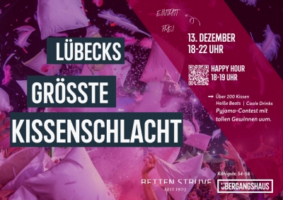 Hier fliegen die Federn! Wenn über 200 Kissen gleichzeitig durch die Lüfte wirbeln, ist klar: Lübeck feiert die wohl fluffigste Pyjamaparty des Jahres! Am Samstag, 13. Dezember 2025, lädt das ÜBERGANGSHAUS, Königstraße 54-56, in Kooperation mit der Firma Betten Struve von 18 bis 22 Uhr zum bunten Partyabend mit der größten Kissenschlacht der Stadt ein. Bei dem Event für Nachtschwärmer:innen stehen Spaß, Musik und Kreativität auf dem Programm.