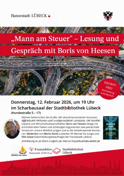 Die Lesung und das anschließende Gespräch, moderiert von Martin Kürle (Lübecker AK Männer für Jungs) und Elke Sasse (Gleichstellungsbeauftragte der Hansestadt Lübeck), findet am Donnerstag, den 12. Februar 2026 um 19 Uhr in der Stadtbibliothek der Hansestadt Lübeck (Hundestraße 5-17) im Scharbausaal statt.