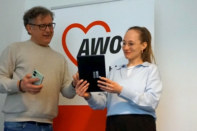 Michelle Östreich, Ehrenamt bei der AWO KV Lübeck mit Tom Stender: „Leichter ins Internet finden mit generationsübergreifender Unterstützung für Senior:innen.“