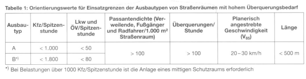 „Es gibt keine definierten Einsatzgrenzen für Gemeinschaftsräume („Shared Space“); gut geeignet sind Plätze oder Straßenzüge mit linearem oder flächigem Fußgängerquerungsbedarf. Solche Bereiche finden sich häufig an Kreuzungsbereichen von stark frequentierten Fußgängerverbindungen (etwa Fußgängerzonen) und Hauptverkehrsstraßen oder an Straßen mit beidseitigem, hoch frequentierten Geschäftsbesatz. Wichtiger ist hierbei weniger eine Obergrenze des Kfz-Verkehrs, als vielmehr eine Mindeststärke an Fußgängern und Radfahrern. Fußgänger und Radfahrer sollten das Straßenbild prägen, auch sollte der Schwerverkehrsanteil nicht sehr hoch und die Kfz-Verkehrsstärke im mittleren Bereich angesiedelt sein. Generell ist eine gute Mischung aller Verkehrsarten wichtig.