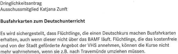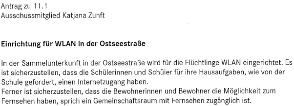 Kurz vor Beginn der Sitzung reichte Frau Zunft zwei Anträge ein, die umverteilt wurden: