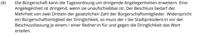 Die Bürgerschaft stimmt bei 1 Gegenstimme mit der erforderlichen 2/3 Mehrheit der gesetzlichen Mitglieder für die Beratung im Wege der Dringlichkeit.