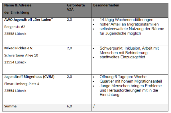 In der Hansestadt Lübeck werden im Jahr 2022 insgesamt 16 Einrichtungen der offenen Kinder- und Jugendarbeit (OKJA) gem. § 11 SGB VIII gefördert. Neun davon befinden sich in Trägerschaft von anerkannten Trägern der freien Jugendhilfe, sieben Einrichtungen sind in städtischer Trägerschaft. Insgesamt stehen rund 44 Vollzeitstellenäquivalente (VZÄ) in der OKJA zur Verfügung. Ein siebzehnter Standort im Stadtteil St. Gertrud wurde von der Bürgerschaft beschlossen (VO/2022/11132).