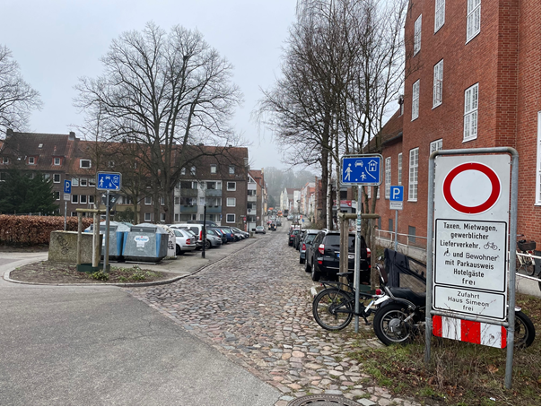 Die Straßen An der Obertrave (südlich der Dankwartsgrube), Lichte Querstraße, Großer Bauhof (zwischen Hartengrube und Effengrube), Kleiner Bauhof (zwischen Effengrube und An der Obertrave), Hartengrube und Effengrube sind straßenverkehrsrechtlich als verkehrsberuhigter Bereich mit dem Richtzeichen Nr. 325.1 (nach Anlage 3 zu § 42 Absatz 2 StVO) „Beginn eines verkehrsberuhigten Bereichs“ angeordnet bzw. beschildert. Die Durchfahrt der Hartengrube und der Düstere[n] Querstraße ist mit der straßenverkehrsrechtlichen Anordnung bzw. Beschilderung des Vorschriftzeichens Nr. 250 nach Anlage 2 (zu § 41 Absatz 1 StVO) „Verbot für Fahrzeuge aller Art“ mit Zusatzzeichen (Taxen, Mietwagen, gewerblicher Lieferverkehr, Radfahrer (Symbol), Schwerbehinderte (Symbol) und Bewohner mit Parkausweis frei; Hotelgäste frei und Zufahrt Haus Simeon frei [siehe Abb. 2 Hartengrube]) untersagt.